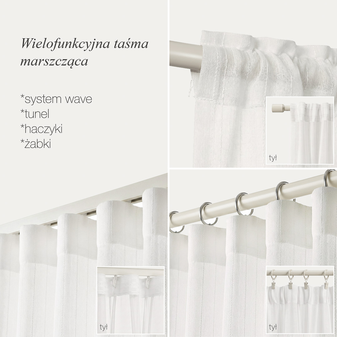 - wersja: taśma - montaż na żabki, agrafki, haczyki, ślimaki, tunel. Taśma nie ma ustalonego stopnia marszczenia - można ją marszczyć dowolnie w zależności od preferencji