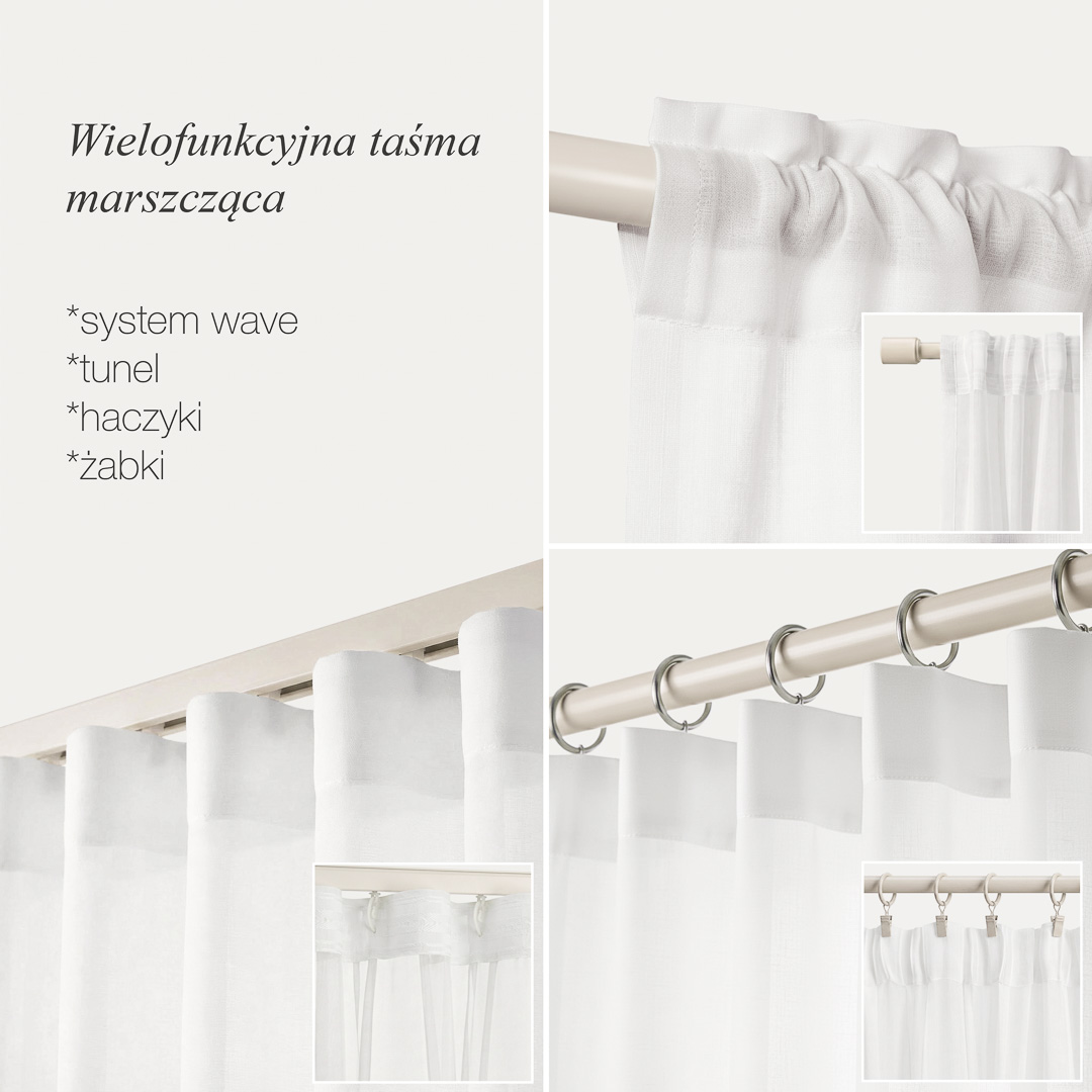 - wersja: taśma - montaż na żabki, agrafki, haczyki, ślimaki, tunel. Taśma nie ma ustalonego stopnia marszczenia - można ją marszczyć dowolnie w zależności od preferencji