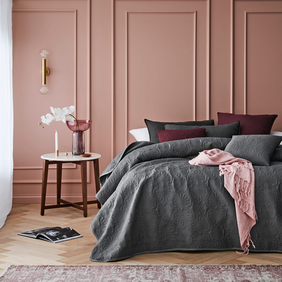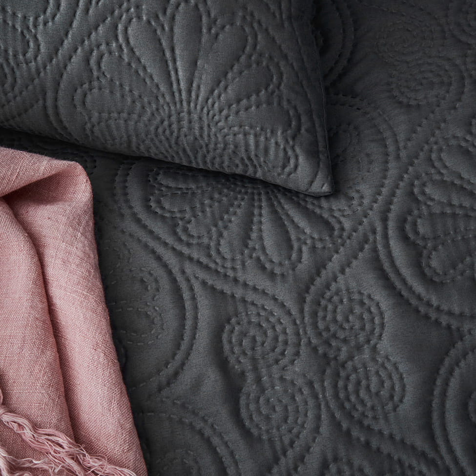 Ciemnoszara narzuta na łóżko Leila. Estetyka kolekcji subtelnie lawiruje pomiędzy stylami, wyróżnia ją ponadczasowość i wysublimowany design. Delikatnie pikowane detale tworzą piękny, ornamentowy wzór, który z gracją ożywia monochromatyczne wnętrze. Gładka, matowa tkanina narzutą zdobiona lamówką, łączy w sobie harmonię i komfort, tworząc przytulną przestrzeń w której dobrze się wypoczywa. Narzuta posiada olbrzymi potencjał aranżacyjny, zawiera w sobie bogate spektrum barw - od spokojnych kolorów z nutą ciepła po głębokie, wyraziste tony.