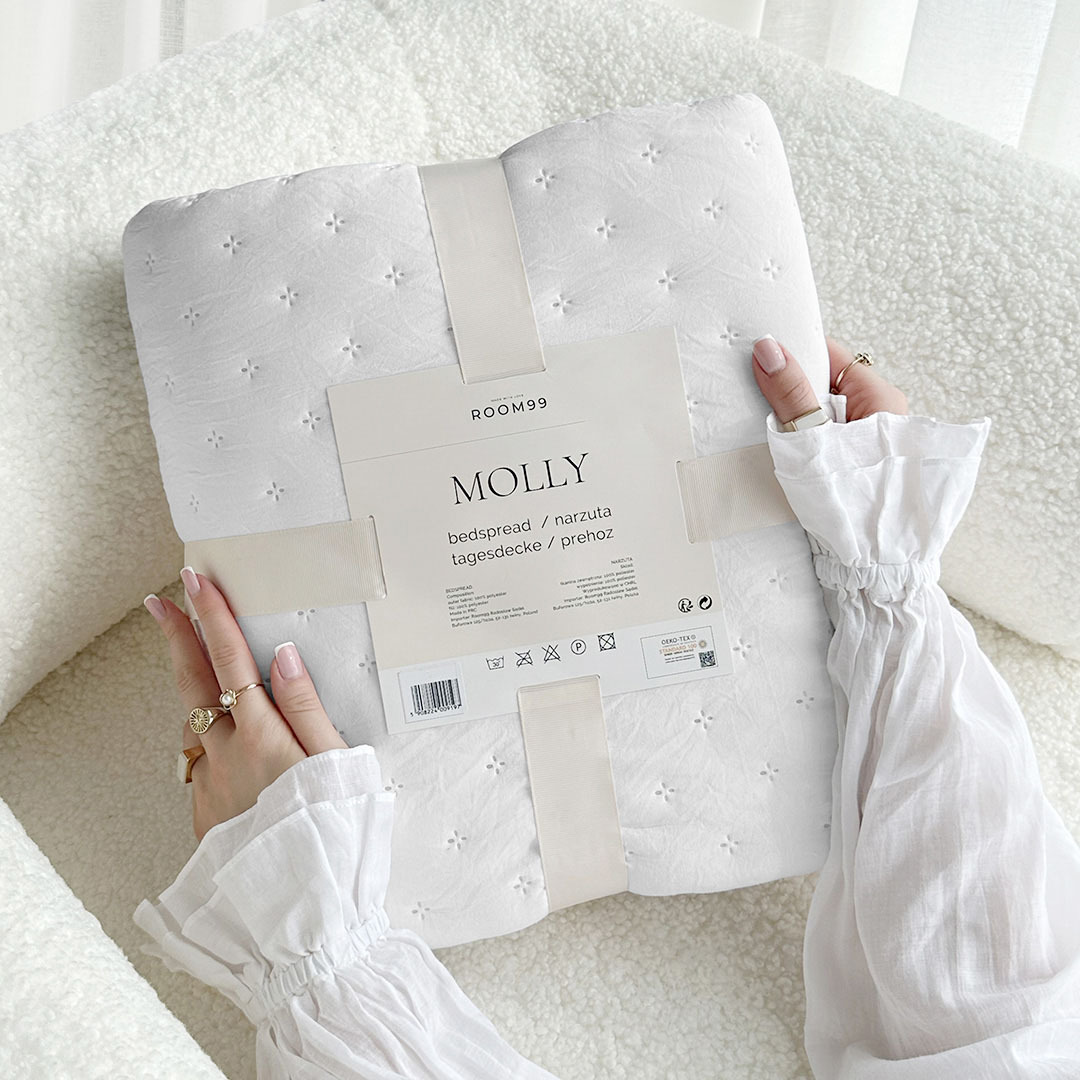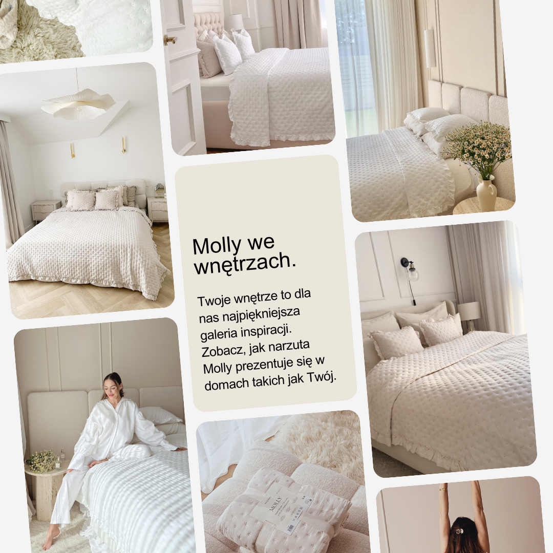 Narzuta na łóżko Molly – lekka, otulająca swoim ciepłem kolekcja, która kumuluje w sobie cały zbiór starannie zaprojektowanych detali. Zachwyci Cię subtelnymi pikowaniami i uroczą falbaną, która zdobi jej boki. Z wnętrza wydobywa ducha subtelnej elegancji i jest dokładnie tym, czego potrzebujesz, aby stworzyć w swojej sypialni absolutnie kojący nastrój. Ultra miękka i zmysłowa – zamów i poddaj się jej urokowi!