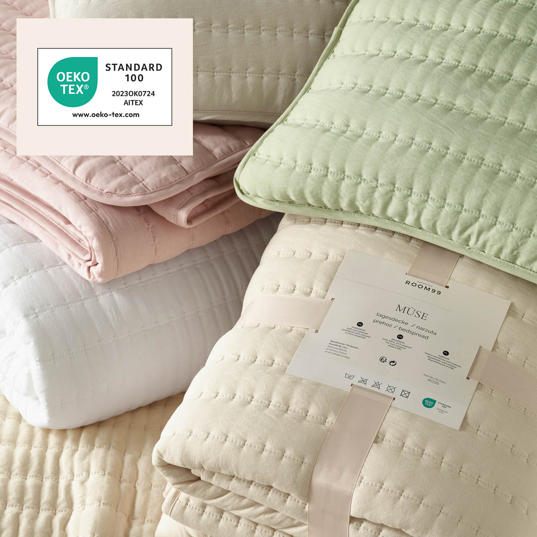 Narzuta Mùse posiada Certyfikat Oeko-Tex 100 - świadectwo bezpieczeństwa i najwyższej jakości produktów tekstylnych.