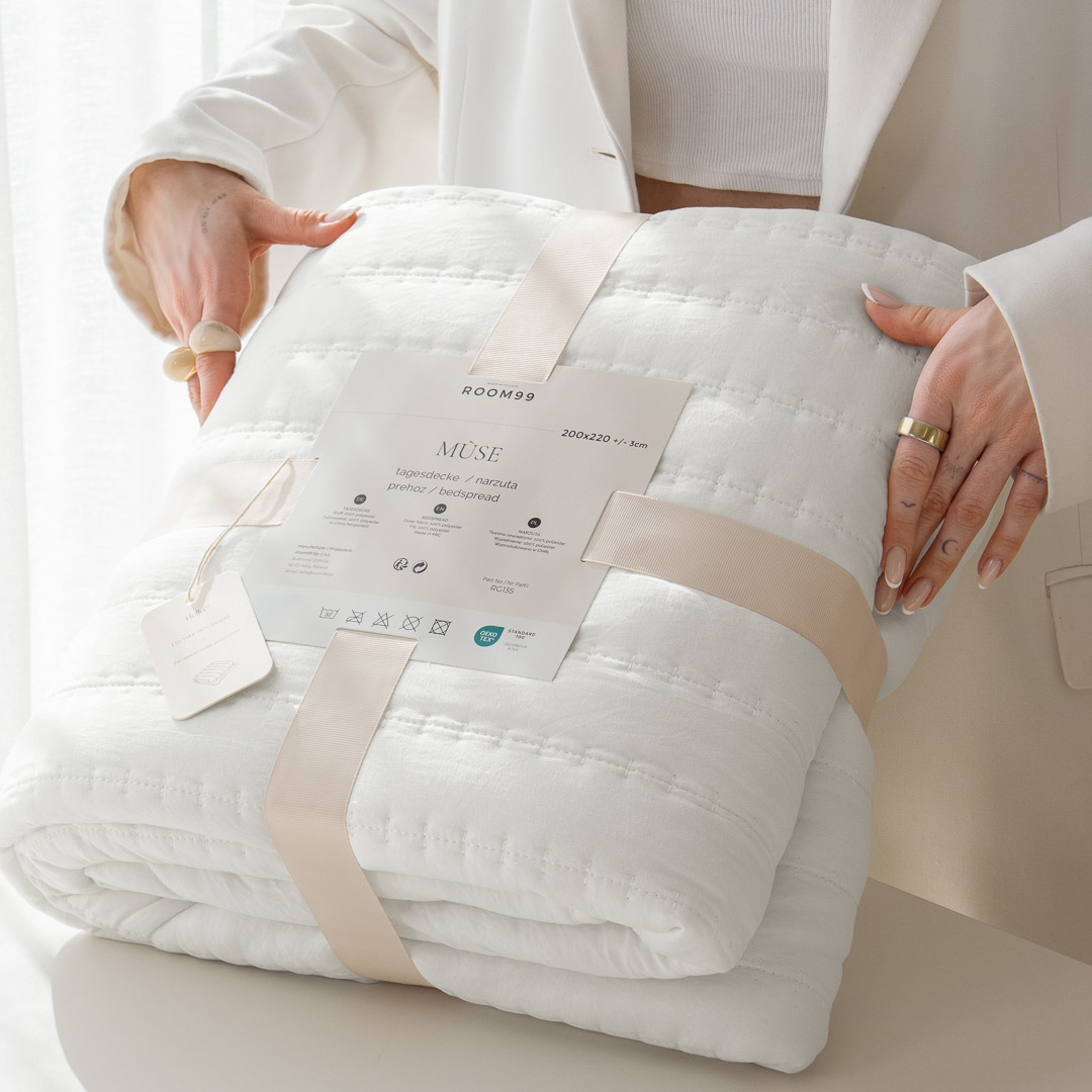 Narzuta na łóżko Mùse to opowieść o lekkości i strukturze, które spotykają się w idealnej równowadze. Gęste pikowanie tworzy wyraźny, uporządkowany wzór, który nadaje tkaninie wyrazistości i nowoczesnego charakteru. Uszyta z przyjemnej, matowej tkaniny, łączy w sobie funkcjonalność i piękno – układa się gładko, porządkuje przestrzeń i dodaje wnętrzu harmonii. Wypełnienie o większej objętości otula łóżko puszystą miękkością, zapraszając do zanurzenia się w chwilę relaksu. Ta narzuta to więcej niż okrycie — to detal, który podkreśla styl i nadaje sypialni nową energię.