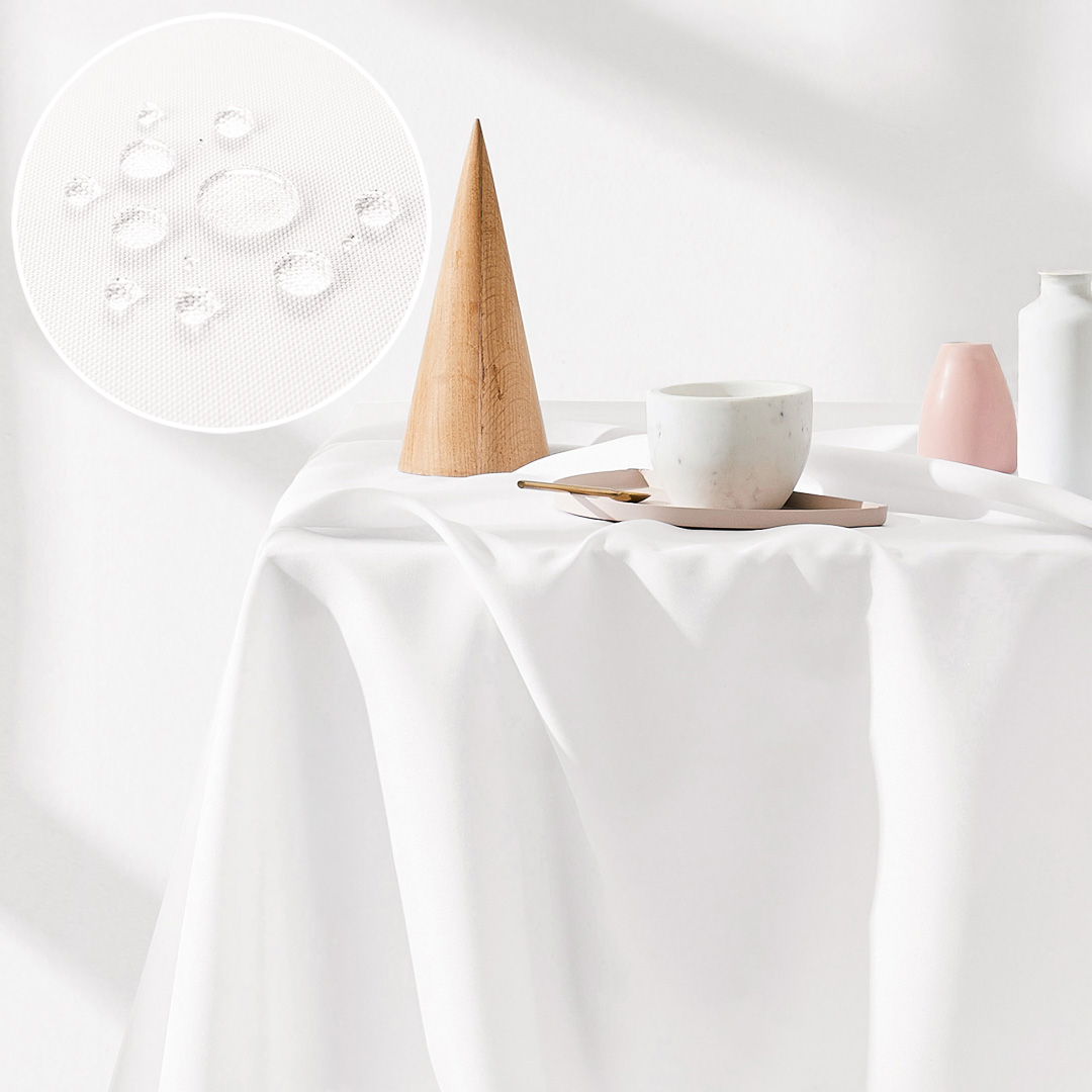 Obrus został zabezpieczony apreturą plamoodporną co uniemożliwia przenikanie cieczy i powstrzymuje powstawanie trwałych zabrudzeń. Zabieg ten sprawia, że rozlany płyn tworzy ,,efekt kropelek'' i nie wnika w strukturę obrusa, dzięki czemu przez długi czas zachowuje świeżość i schludny wygląd.