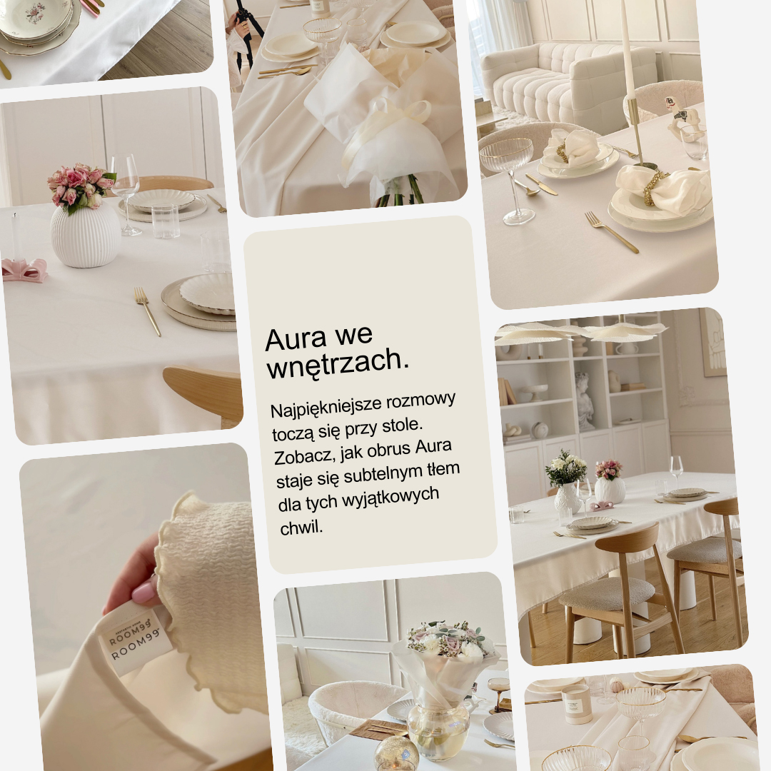 Plamoodporny obrus Aura z wdziękiem udekoruje stół podczas codziennych spotkań i uroczystych chwil takich jak święta, komunie, wesela oraz urodziny. Obrus Aura znajduje również szerokie zastosowanie w restauracjach i lokalach gastronomicznych. Miękka, matowa i gładka tkanina z której został uszyty doskonale układa się na stole.