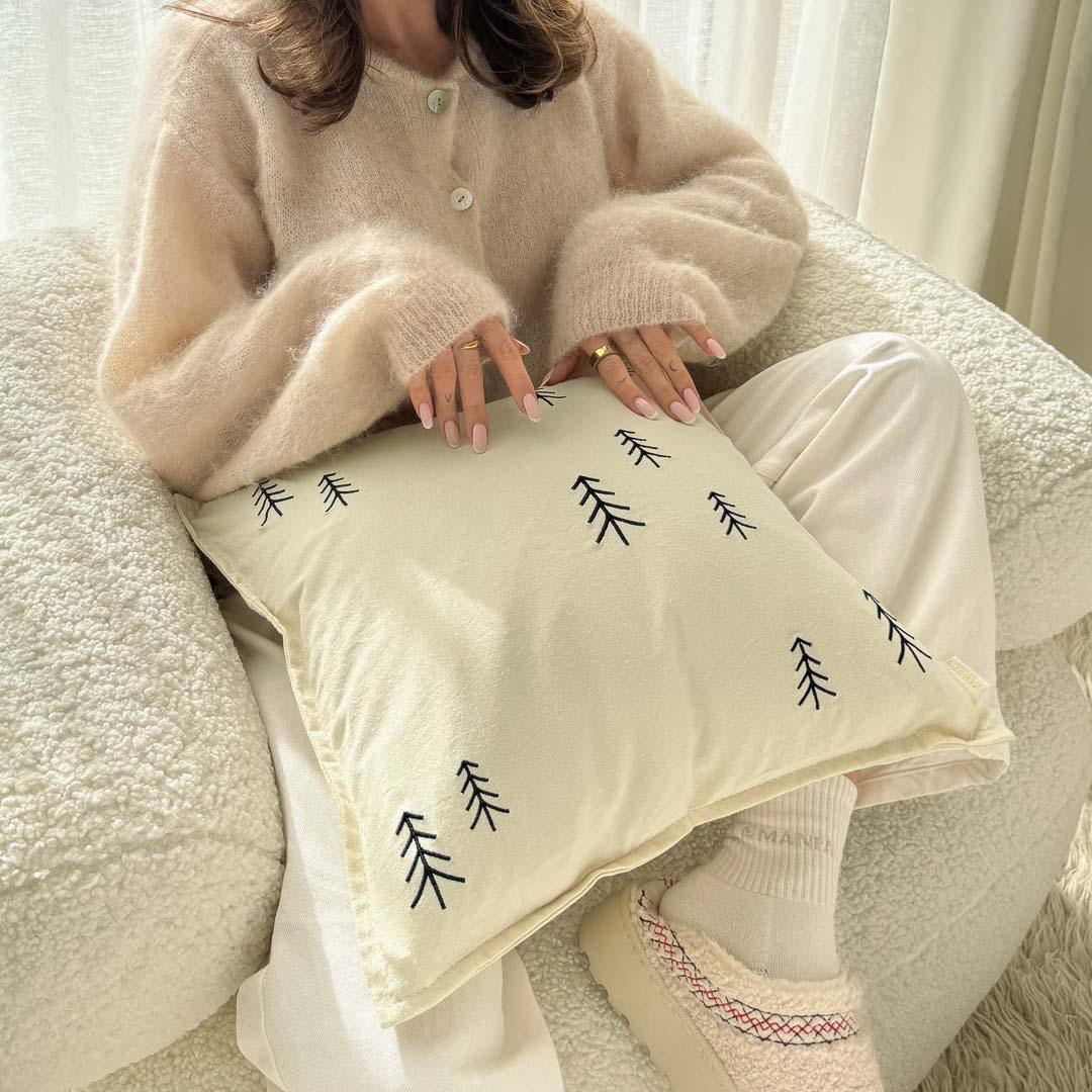 Poduszka świąteczna Holly to propozycja dla tych, którzy szukają spokojnej, minimalistycznej dekoracji na grudniowe dni. Została uszyta z przyjemnej w dotyku bawełny i ozdobiona subtelnym haftem w kształcie choinek. Kremowy kolor poduszki rozjaśnia wnętrze i wprowadza atmosferę łagodnej harmonii. Ta kolekcja sprawdzi się zarówno w klasycznych aranżacjach, jak i nowoczesnych, minimalistycznych przestrzeniach – jako delikatny akcent świątecznego nastroju.