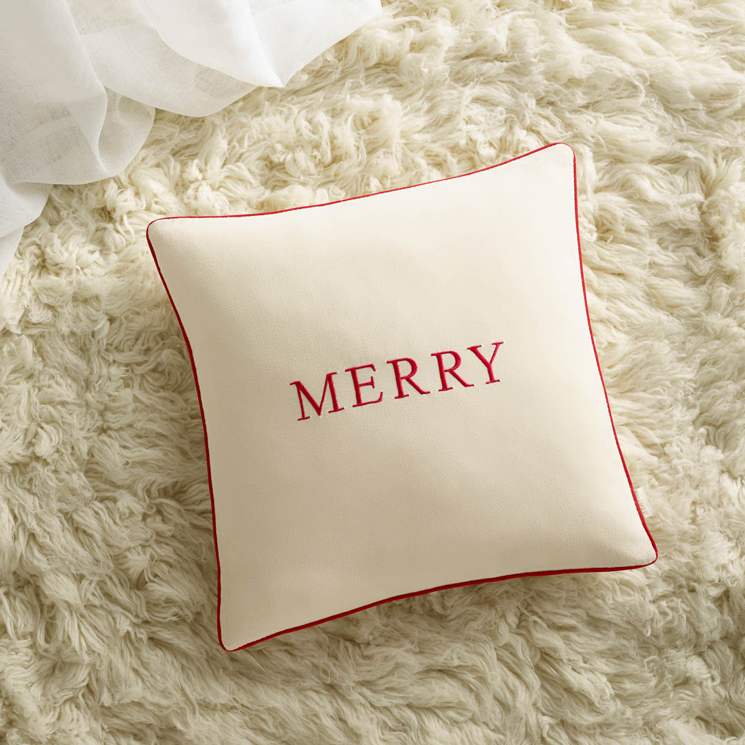 Poduszkę uszyliśmy z miękkiej, przyjemnej w dotyku bawełny. Wierzch poduszki zdobi starannie haftowany napis Merry. Jej kremowy odcień rozświetla subtelnie przestrzeń, a głęboka czerwień lamówki wnosi klasyczny, świąteczny akcent. To dekoracja stworzona do wnętrz, w których liczy się ciepło, bliskość i codzienna magia drobiazgów. Poczuj jej klimat i pozwól, by Twój dom nabrał świątecznego rytmu.