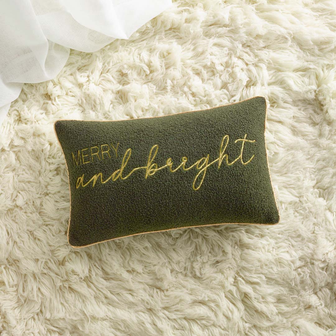 Poduszka świąteczna Merry & Bright 30x50 cm ciemnozielona z haftowanym napisem
