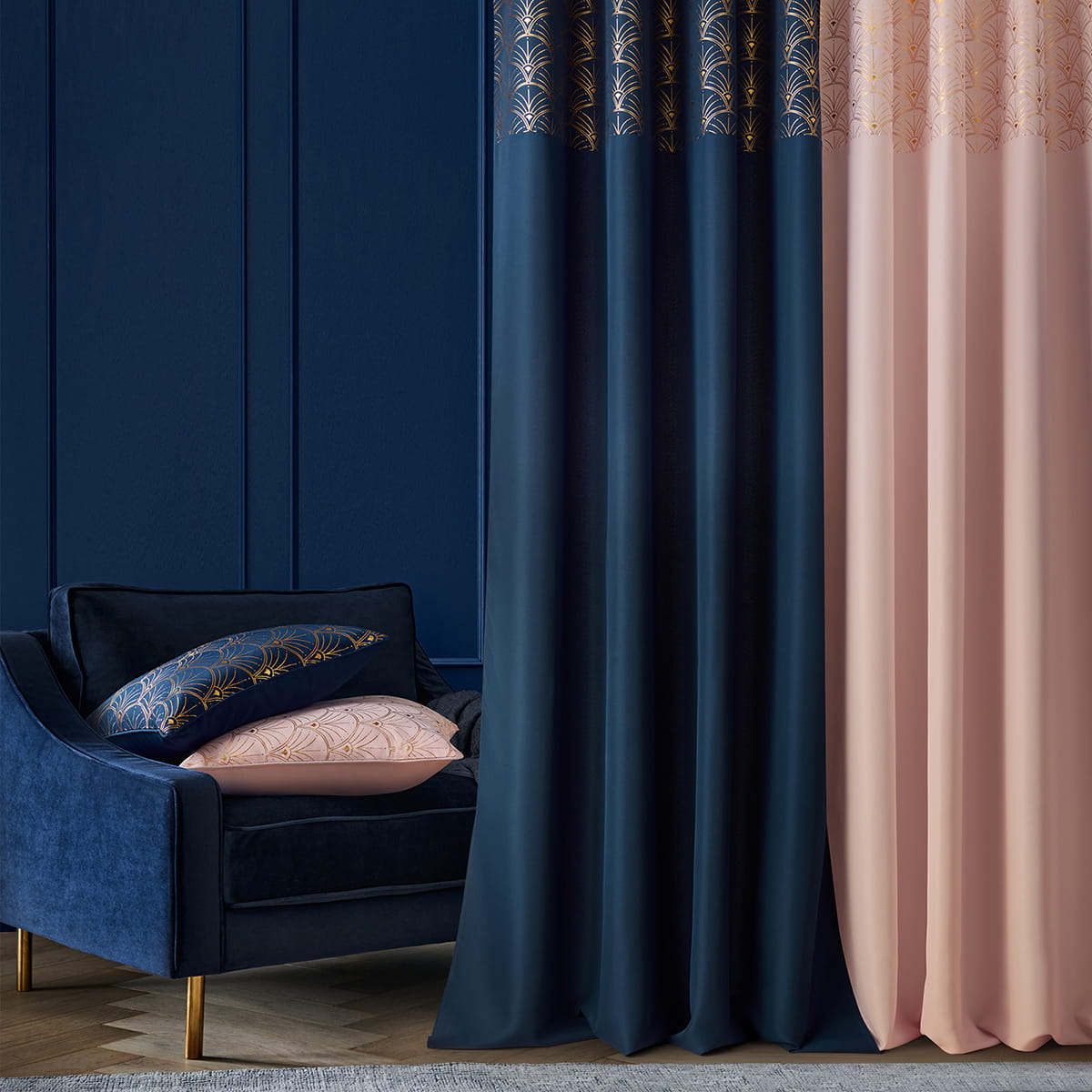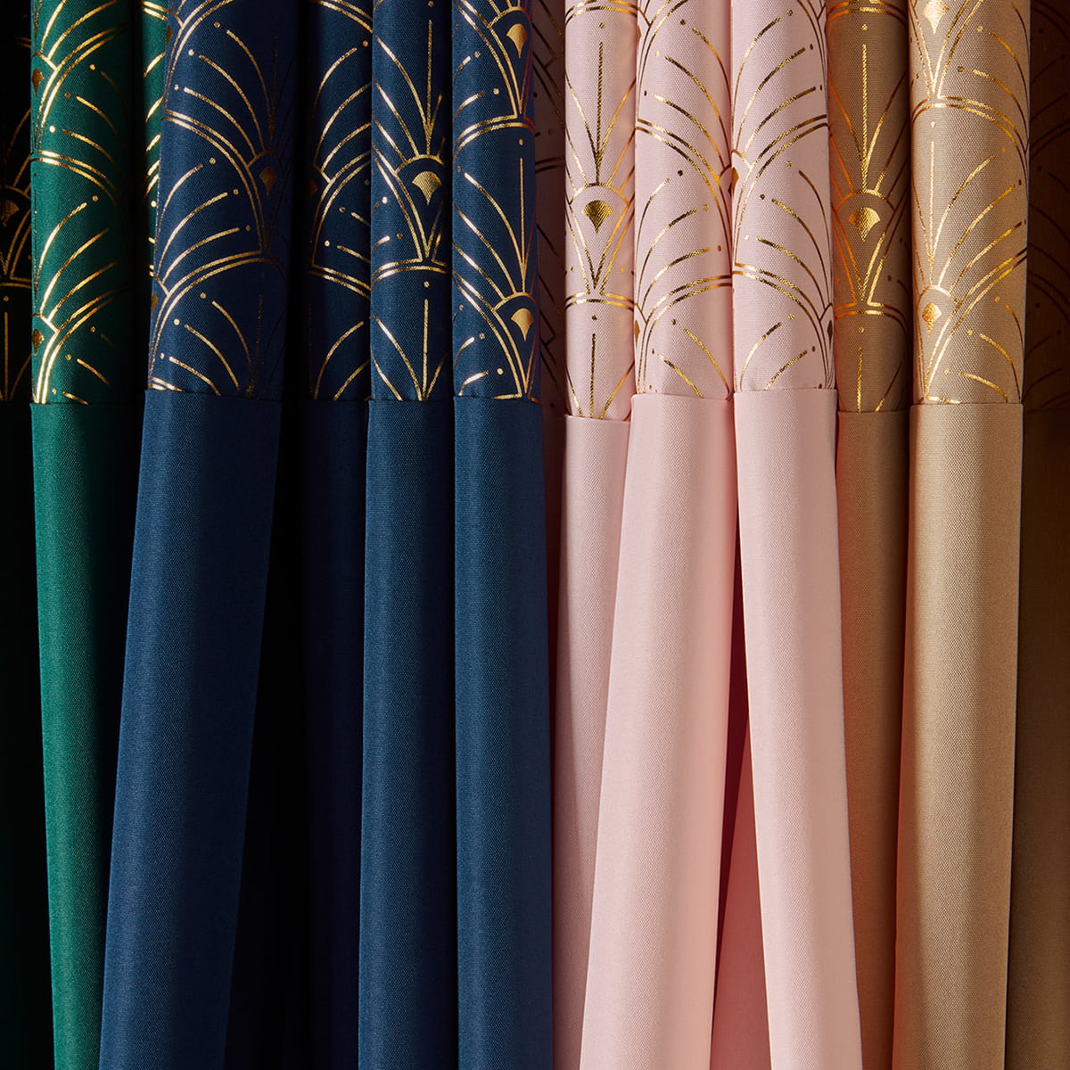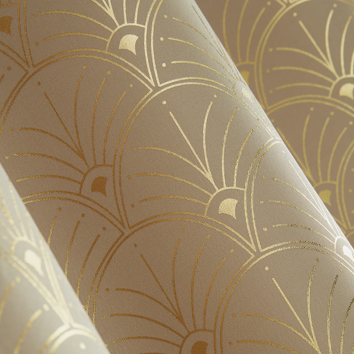 Beżowe zasłony w stylu glamour 140x280 ze złotym nadrukiem