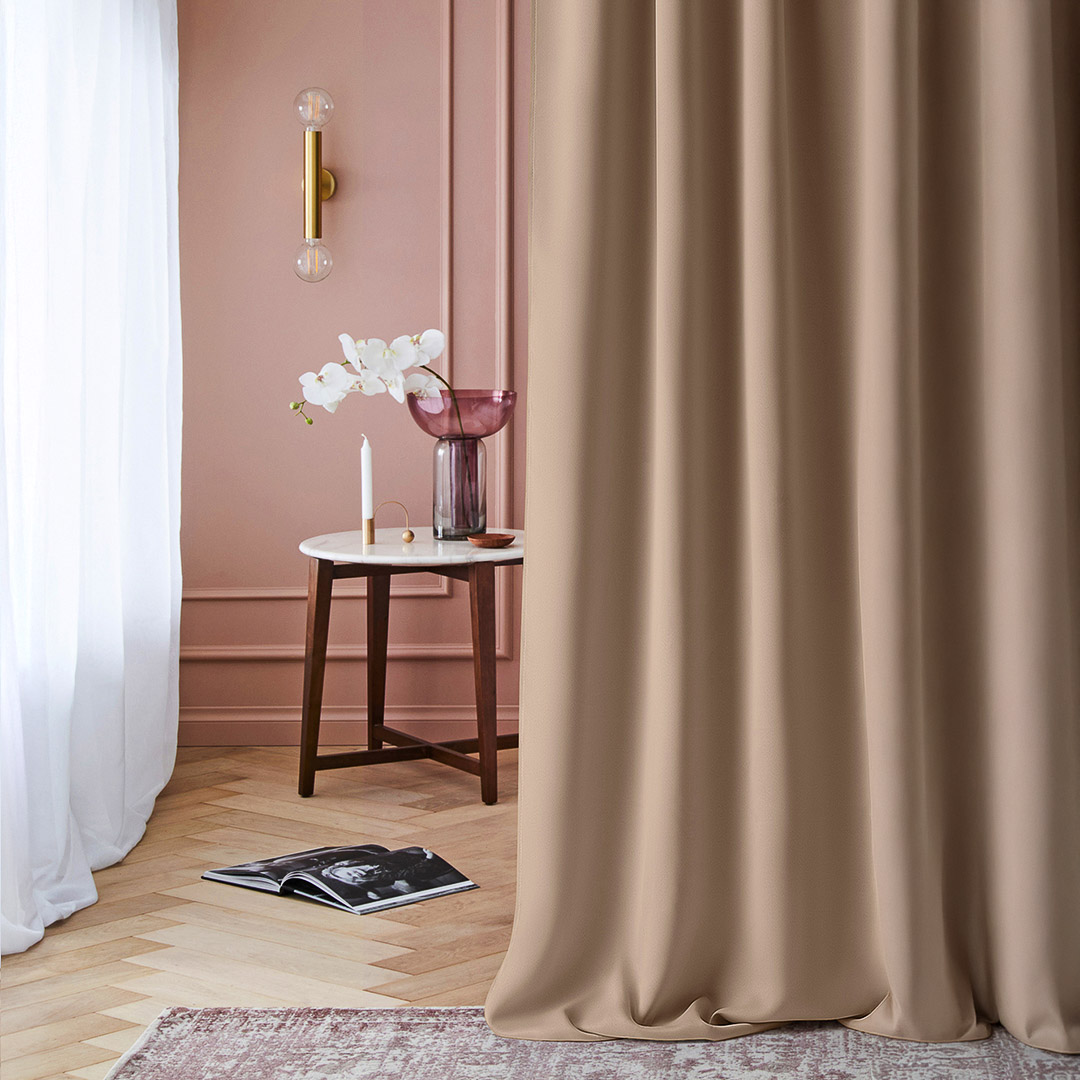 Zasłona Laurel została uszyta z wysokiej jakości, matowej, tkaniny o gęstym splocie. Zawieszona w oknie przepięknie układa się tworząc efekt miękkich fal. Gruby materiał doskonale zaciemnia pomieszczenie, chroni wnętrze przed słońcem oraz zapewnia większą prywatność.