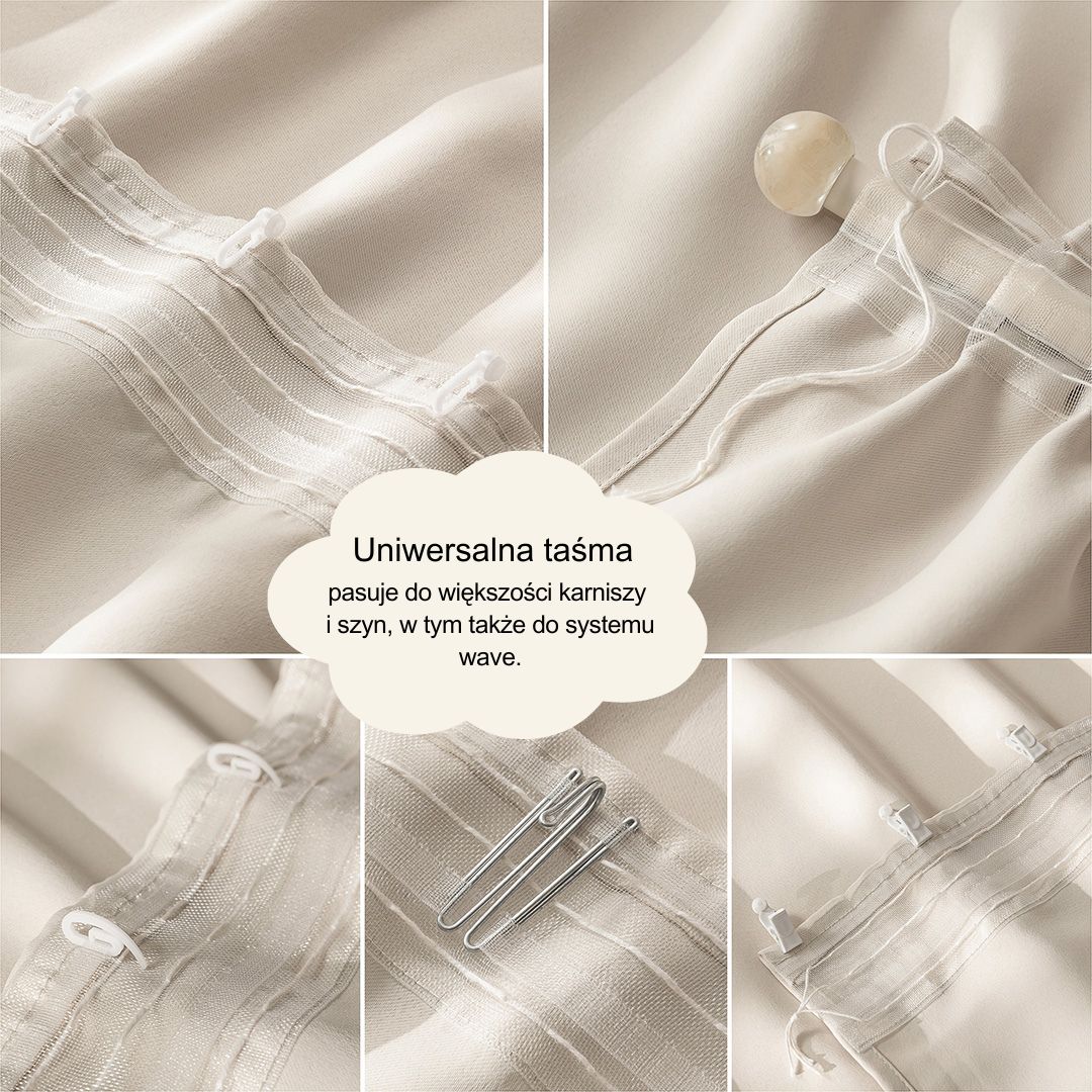 - Montaż - taśma łatwy sposób montażu zasłony na wave lub za pomocą żabek, agrafek, haczyków, ślimaków. Zasłona posiada również tunel umożliwiający mocowanie bezpośrednio na karniszu/ szynie.
